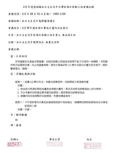 113年度雲林縣私立文生高中台灣母語日推動小組會議紀錄